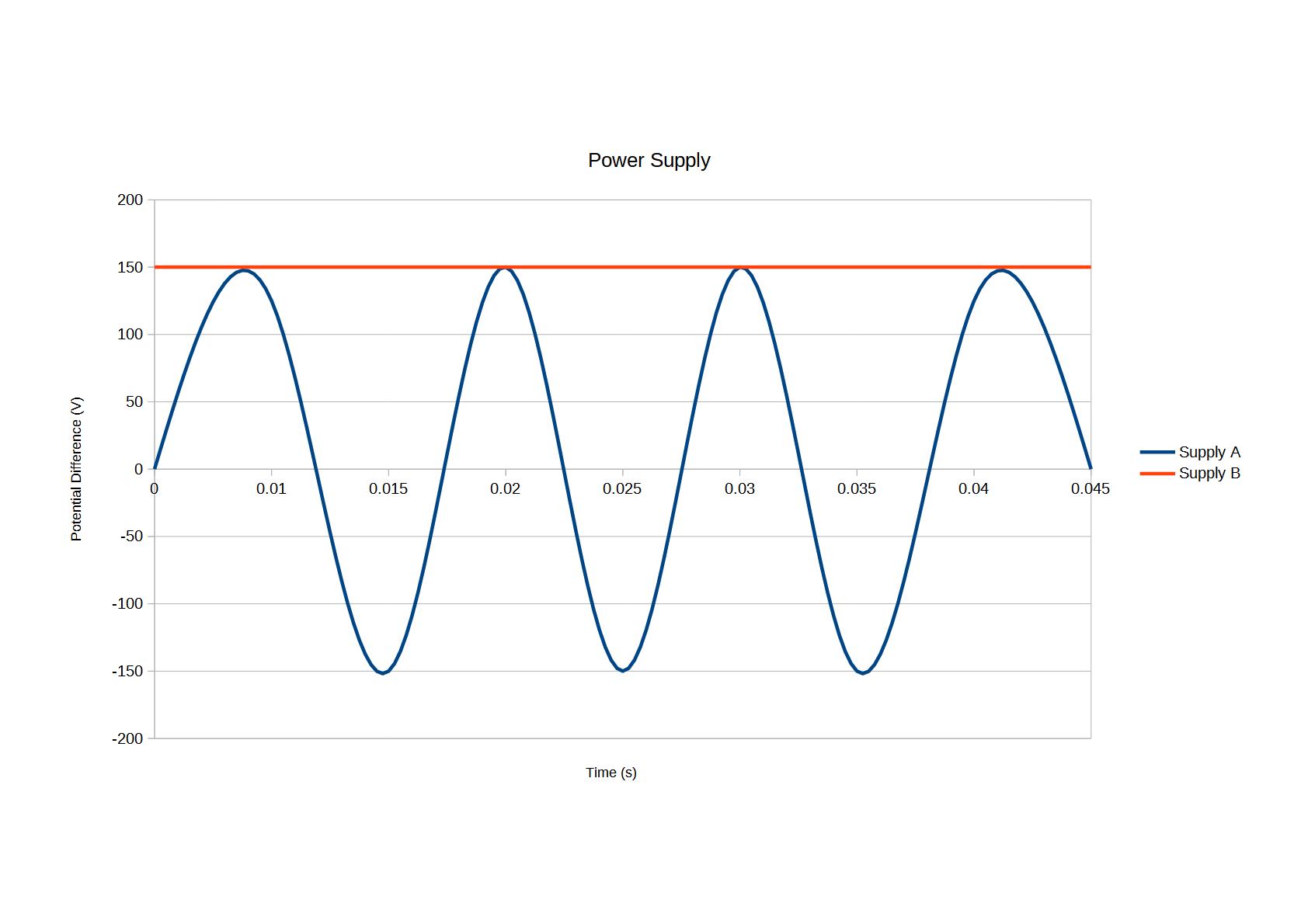 The graph shows that supply A has a potential difference that is constant at around 150v. Because the potential difference is changing we know this is a direct current (DC).